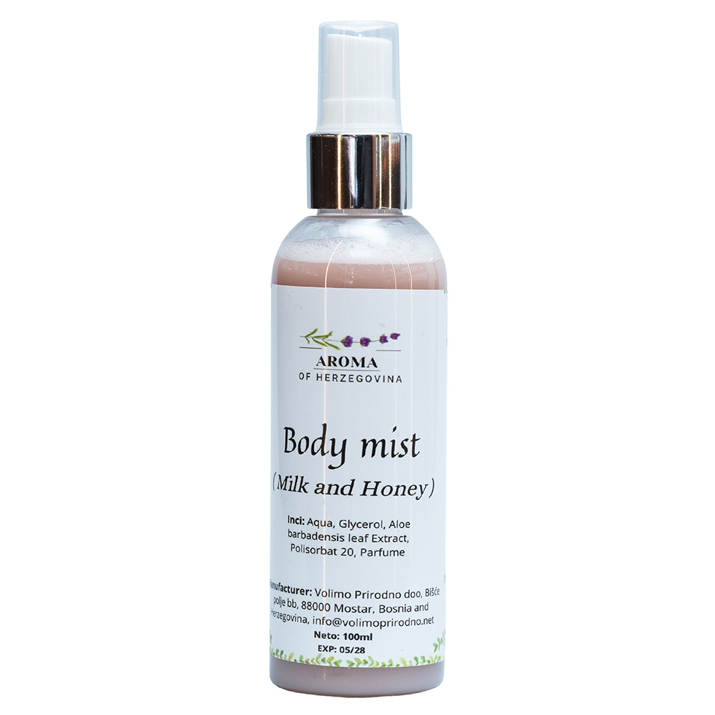 Ovaj body mist s mirisom mlijeka i meda pruža nježno osvježenje i ugodan, topao miris koji ostaje na koži. Lagana maglica je idealna za svakodnevnu upotrebu, kada želiš suptilan miris bez intenziteta parfema. Formula s dodatkom glicerina i aloe vere pomaže da koža ostane hidratizirana i ugodna na dodir. Miris je mekan, kremast i blago sladak, savršen za opuštene dnevne trenutke ili večernje rituale njege. Raspršivač stvara finu maglicu koja se ravnomjerno nanosi i brzo suši. Može se koristiti samostalno ili u kombinaciji s losionom za tijelo istog mirisnog profila. Praktična bočica čini ga odličnim izborom za torbu, putovanja i brzo osvježenje tokom dana.