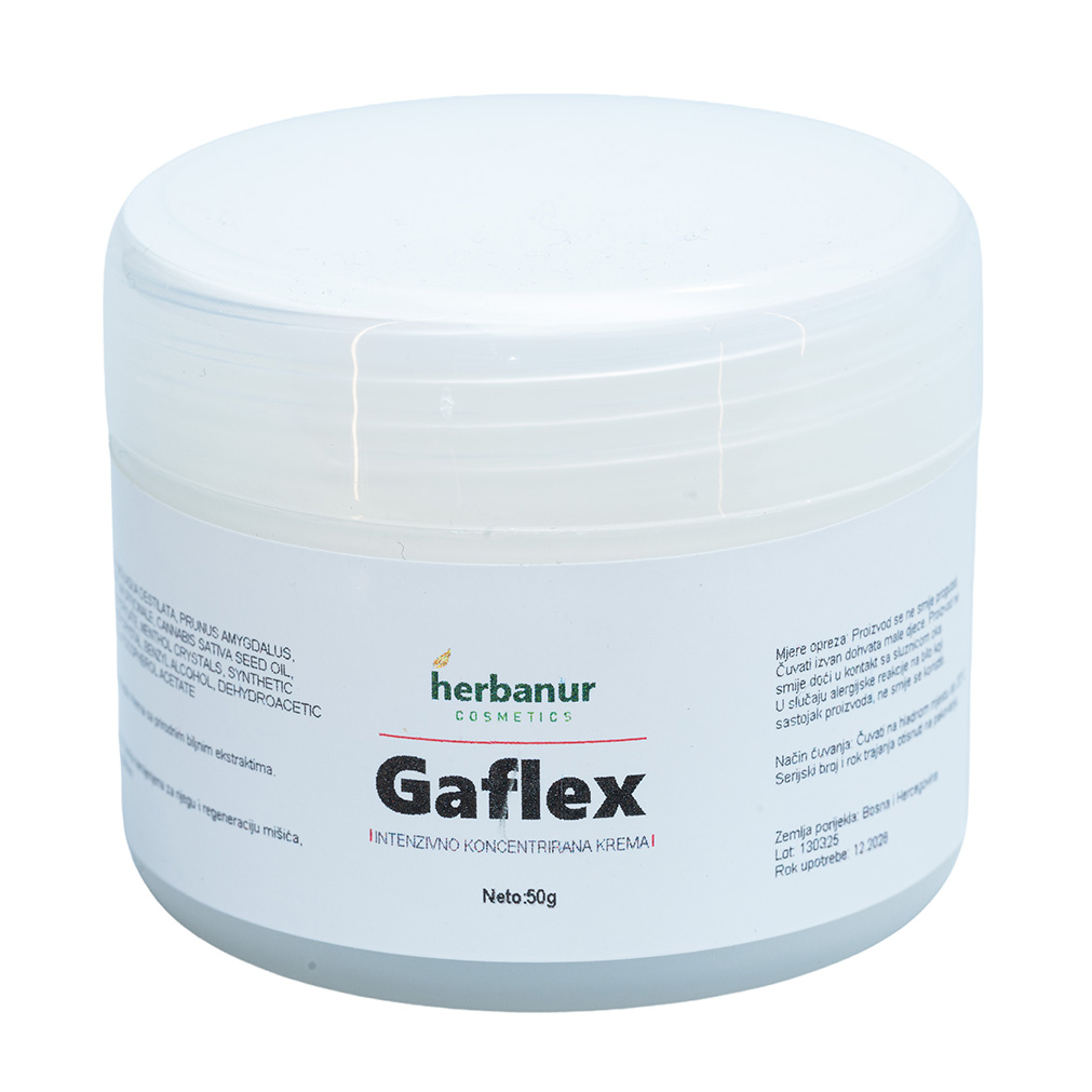 Gaflex je intenzivno koncentrirana krema namijenjena njezi bolnih, ukočenih i opterećenih dijelova tijela. Bogata tekstura se lako razmazuje i omogućava ciljano nanošenje na zglobove, mišiće, leđa i vrat. Krema se brzo upija i ostavlja osjećaj topline i ugode, bez masnog traga na koži. Posebno je pogodna nakon fizičkog napora, dugog stajanja ili sjedenja, kao i u periodima povećane osjetljivosti zglobova. Redovnom upotrebom doprinosi osjećaju rasterećenja i poboljšane pokretljivosti. Može se koristiti samostalno ili kao dio svakodnevne rutine njege tijela. Nanosi se laganom masažom, po potrebi više puta dnevno.