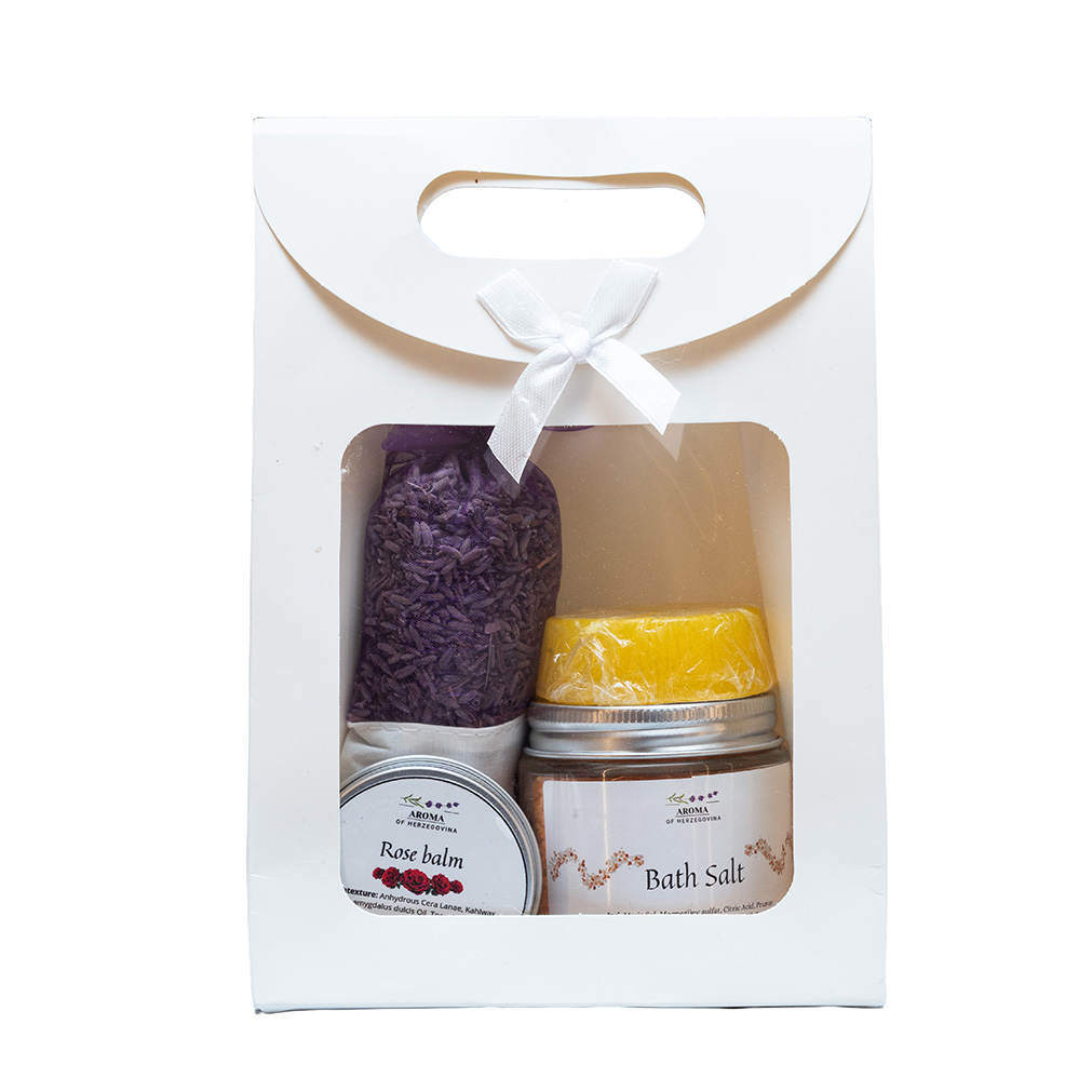 Sadržaj seta: sapun, balzam za tijelo (ruža), kupka sol, vrećica lavande
